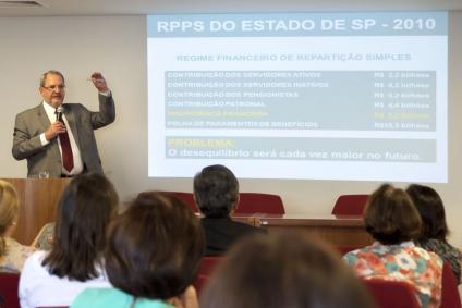 Em 15/02, a Apesp iniciou um ciclo de palestras com o objetivo de esclarecer os associados sobre a previdência complementar dos servidores paulistas, instituída pela lei nº 14.653, de 22/12/2011. Os primeiros palestrantes foram Carlos Henrique Flory, diretor-presidente da SPPREV, e José Roberto de Moraes, procurador do Estado e secretário-executivo da SPPREV. Para a presidente da Apesp, Márcia Semer, a \”previdência complementar é um tema de suma importância e que está na ordem do dia\”. Representantes de entidades de classe de outros segmentos do funcionalismo do Estado de São Paulo também marcaram presença no evento: Teruo Massita, presidente da Afresp; e Morvan Meirelles Costa, diretor do Departamento de Previdência da Apamagis.