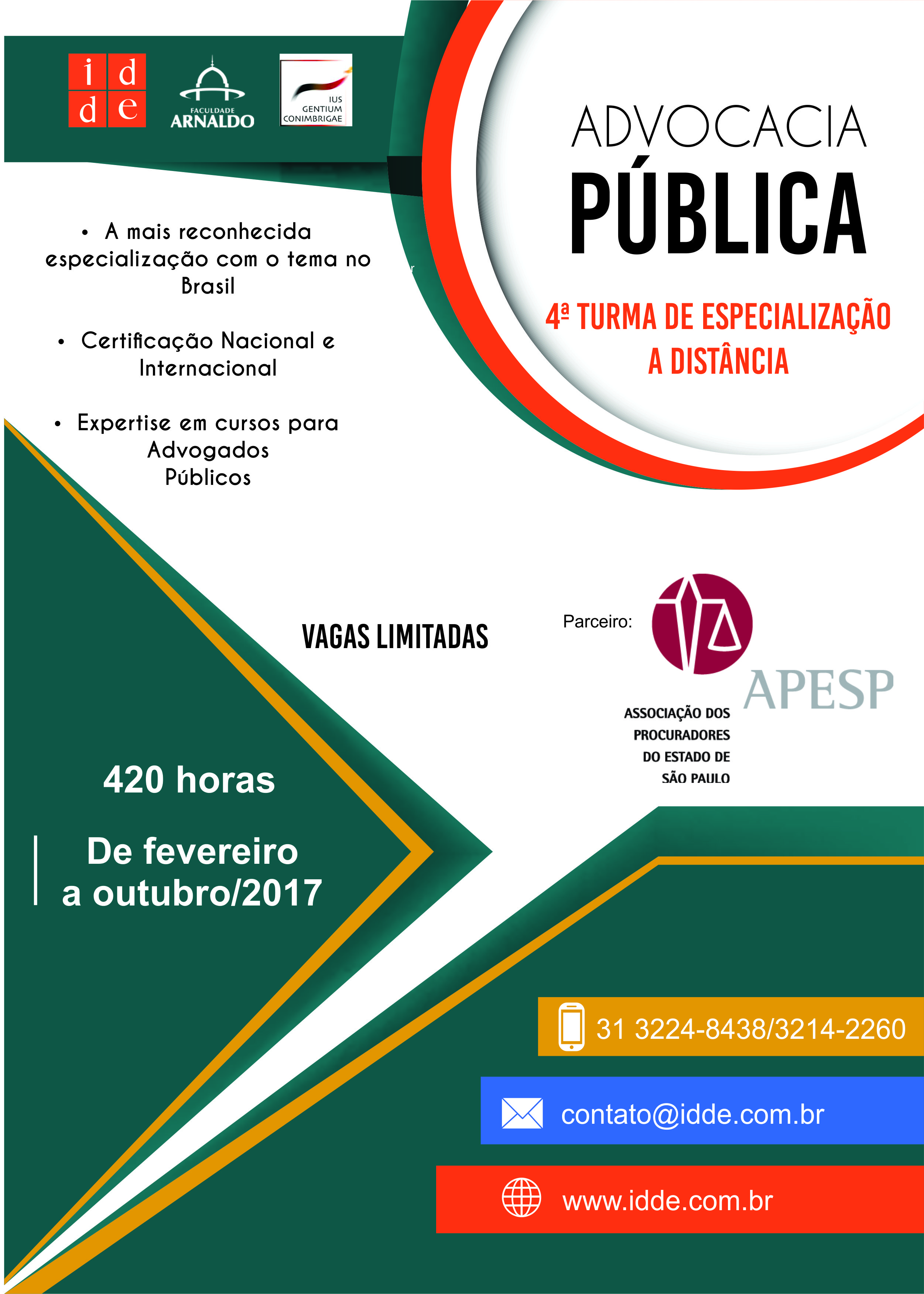 Os associados da APESP têm preços promocionais para matrícula na especialização realizada integralmente a distância através de Plataforma Online com uso das mais modernas ferramentas de tecnologia da educação. Dada a excelência e a singularidade do curso, já foi realizado para várias Instituições de referência, como AGU e várias Procuradorias de Estado e de Município. Caso seja Advogado, Procurador ou interessado em Advocacia Pública, este é o seu curso.
