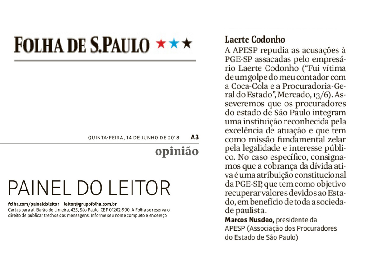 O Jornal “Folha de S. Paulo” publicou hoje (14/6) nota de repúdio da APESP contra as acusações do empresário Laerte Codonho à PGE- SP, em entrevista publicada no jornal “Folha de S. Paulo” (Caderno Mercado, página 5), sob o título “’Fui vítima de um golpe entre contador, Coca-Cola e Procuradoria-Geral’, diz dono da Dolly”.