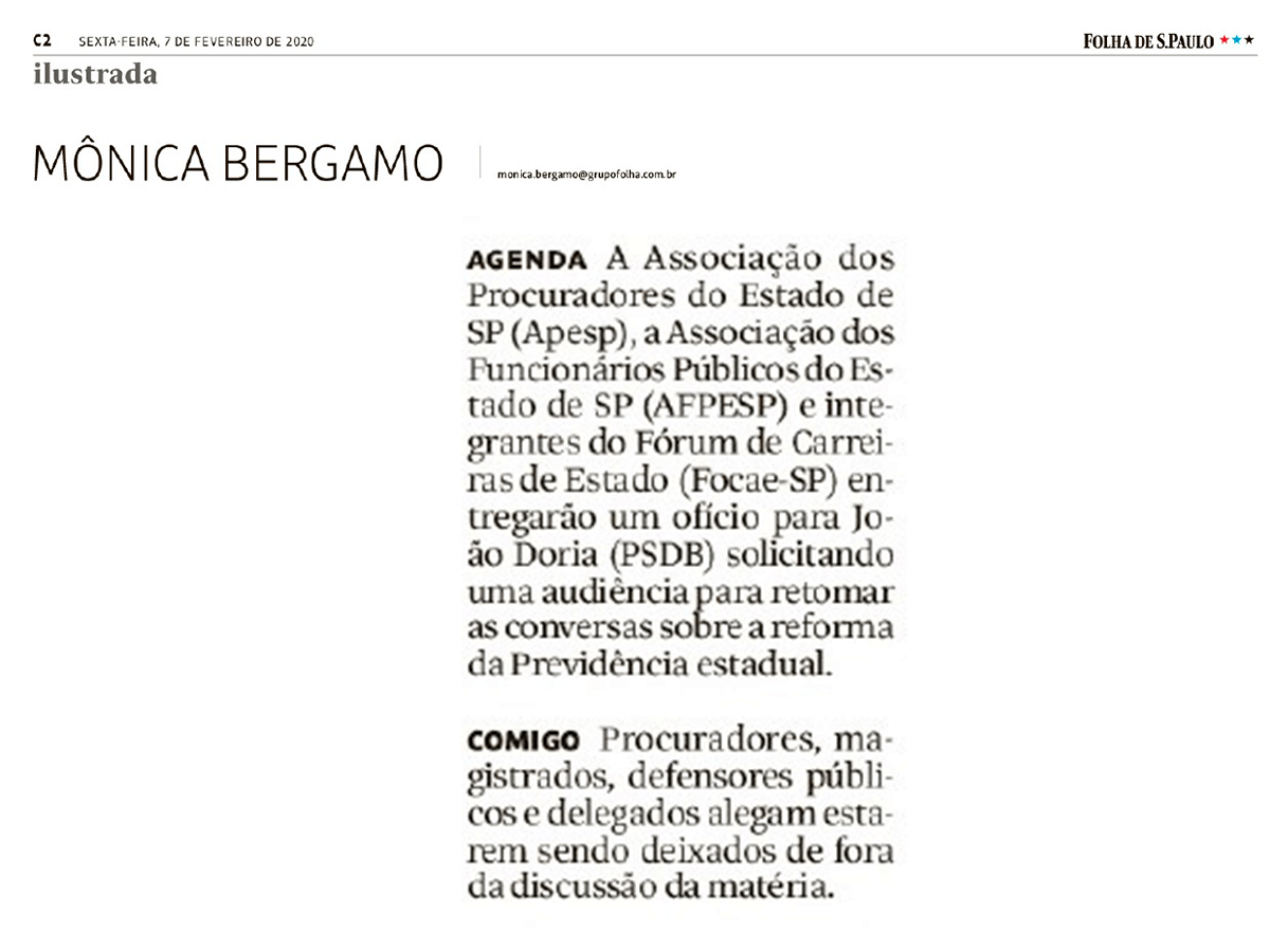 A jornalista Mônica Bergamo publicou hoje (7/2), em sua coluna na Folha de São Paulo, que a APESP e o FOCAE-SP entregarão na próxima segunda-feira (10/2) um ofício para o Governador João Doria solicitando uma audiência para que se abra um diálogo sobre a reforma da Previdência estadual.
