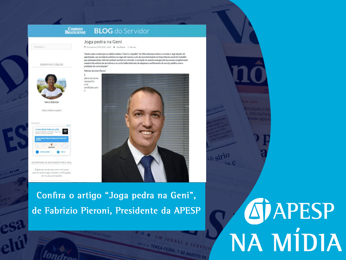 📰 APESP na Mídia: confira o artigo “Joga pedra na Geni”, de autoria do Presidente da APESP, Fabrizio Pieroni, publicado hoje (3/3) no Blog do Servidor, do Correio Braziliense, no qual aponta a precarização do serviço público que a PEC Emergencial, que deve ser votada nesta quarta-feira no Senado Federal, acarretará nos próximos anos.