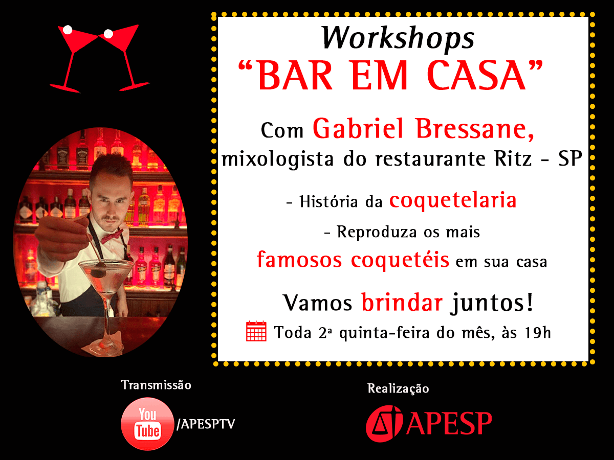 No próximo dia 13 de maio, a APESP dará início à série de workshops “Bar em Casa”, com o mixologista do restaurante Ritz – SP, Gabriel Bressane, que contará um pouco sobre a história da coquetelaria e ensinará a reprodução dos mais famosos coquetéis em sua casa.
