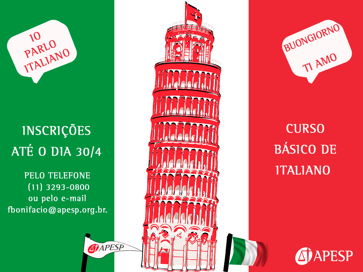 O projeto Bem-estar APESP oferecerá para os associados o curso básico de italiano com a professora, Rosangela Andrioli (acesse no link https://bit.ly/2Q1tt0N o currículo), a partir de 3 de maio, com aulas às segundas-feiras, das 19h30h às 21h00.