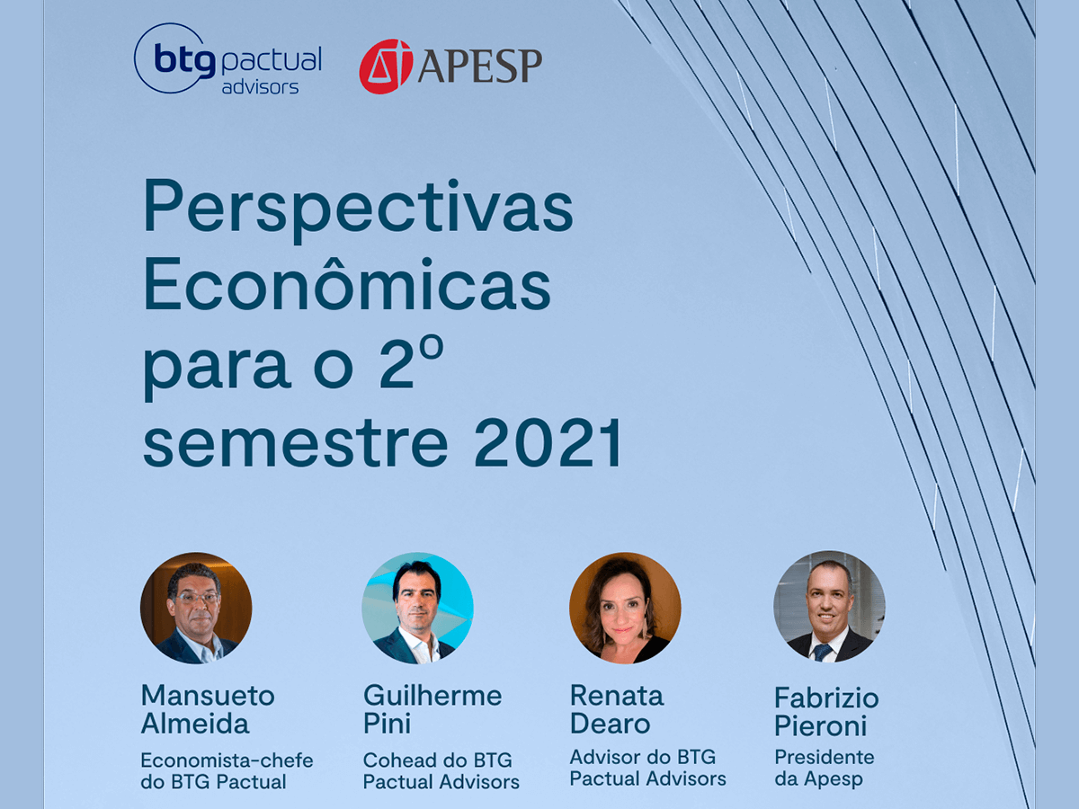📱 No próximo dia 4/8, às 18h30, o Banco BTG Pactual promoverá a live “Perspectivas Econômicas para o 2º semestre de 2021”, com participação do Presidente da APESP, Fabrizio Pieroni, do ex-Secretário do Tesouro Nacional do Brasil e economista chefe do Banco BTG Pactual, Mansueto Almeida, do Cohead do BTG Pactual Advisors, Guilherme Pini, e da Advisor do BTG Pactual Advisors, Renata Dearo.