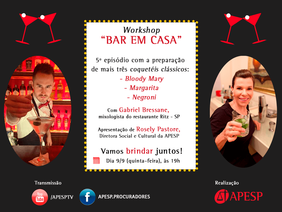 “Chegamos ao último episódio desse workshop, que nos reuniu virtualmente para momentos deliciosos. E será em grande estilo, com a preparação de clássicos da coquetelaria mundial. Quero deixar um agradecimento muito especial ao Gabriel, que com muito conhecimento e carinho nos ensinou como deixar nossos happy hours mais especiais”, destaca Rosely Pastore, Diretora Social e Cultural da APESP, que apresentará o evento e tentará reproduzir os coquetéis.
