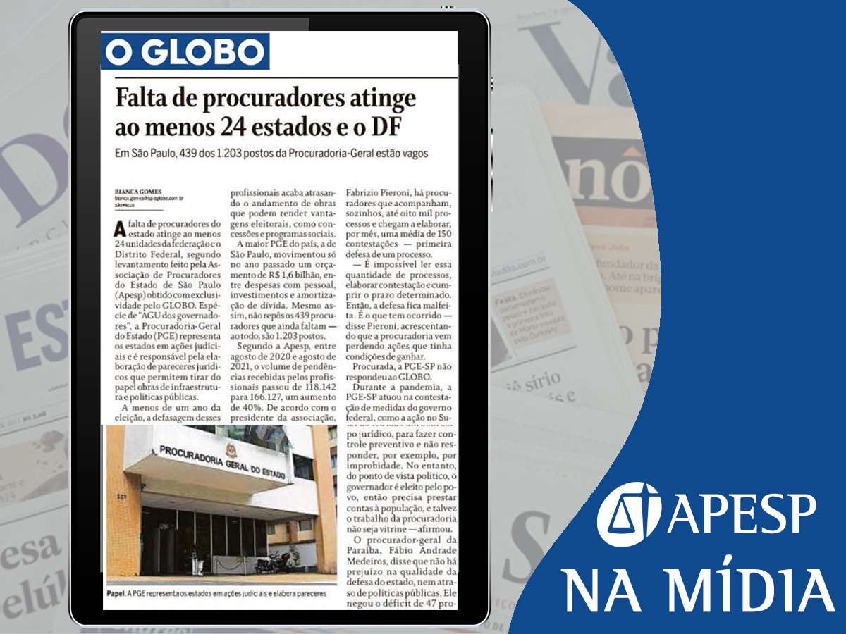 📰 APESP na Mídia: a edição de domingo do jornal “O Globo” trouxe a reportagem “Falta de procuradores atinge ao menos 24 estados e o Distrito Federal”, destacando a situação da PGE-SP, que tem 439 dos 1203 cargos vagos.