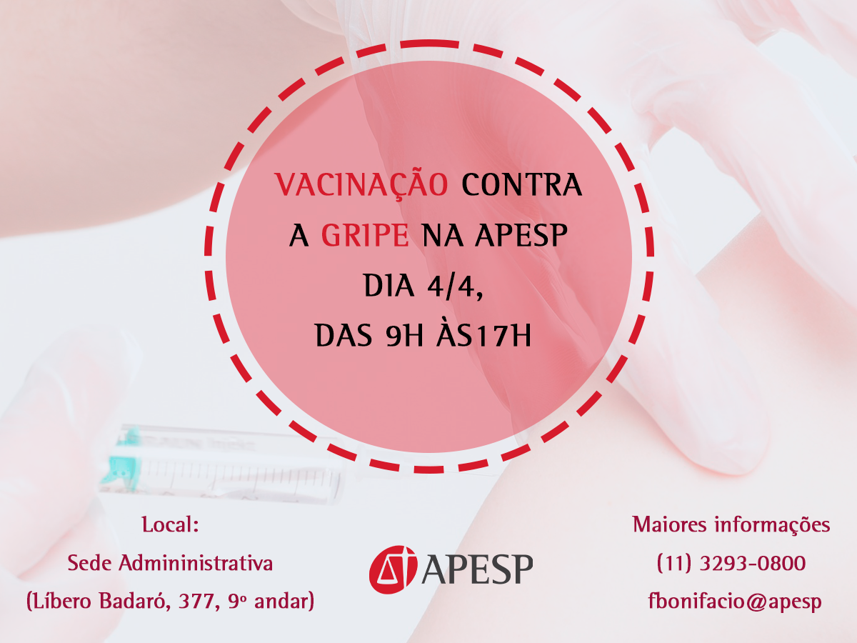 A APESP, com o objetivo de oferecer maior comodidade para seus associados, promoverá no dia 4 de abril, das 9h às 17h, em sua sede administrativa da APESP (Rua Líbero Badaró, nº 377, 9º andar), um dia de vacinação contra a gripe. Foram adquiridas 300 doses, que serão assim distribuídas: