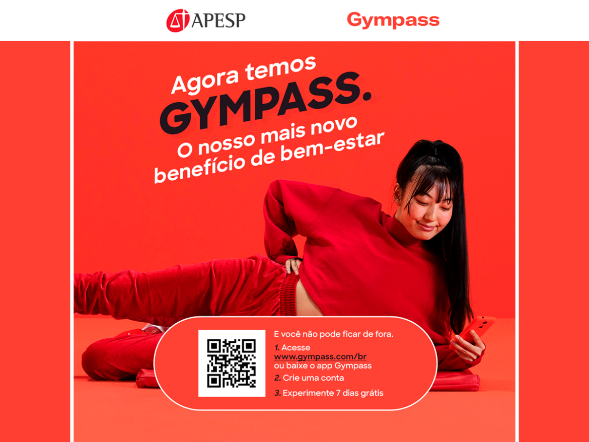 Hoje (6), inicia-se a parceria da APESP com o Gympass, uma plataforma que oferece a maior rede de academias, estúdios e aplicativos de bem-estar, com diversas modalidades (pilates, yoga, lutas, bike, natação, crossfit, terapias etc).